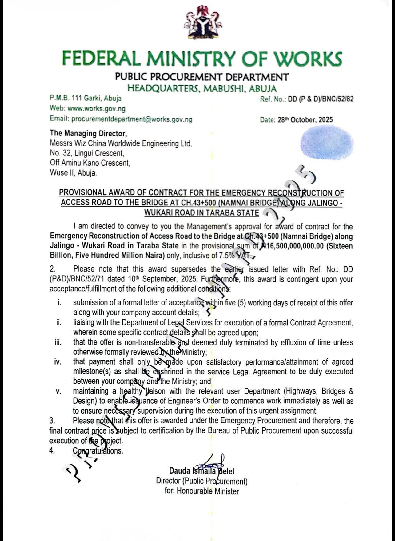 A fresh controversy has erupted over the prolonged delay in the reconstruction of the collapsed Namnai Bridge in Taraba State, as public affairs commentator, Abdulumin Imam, has accused the Minister of State for Regional Development, Uba Maigari Ahmadu, of deliberately frustrating the project.
